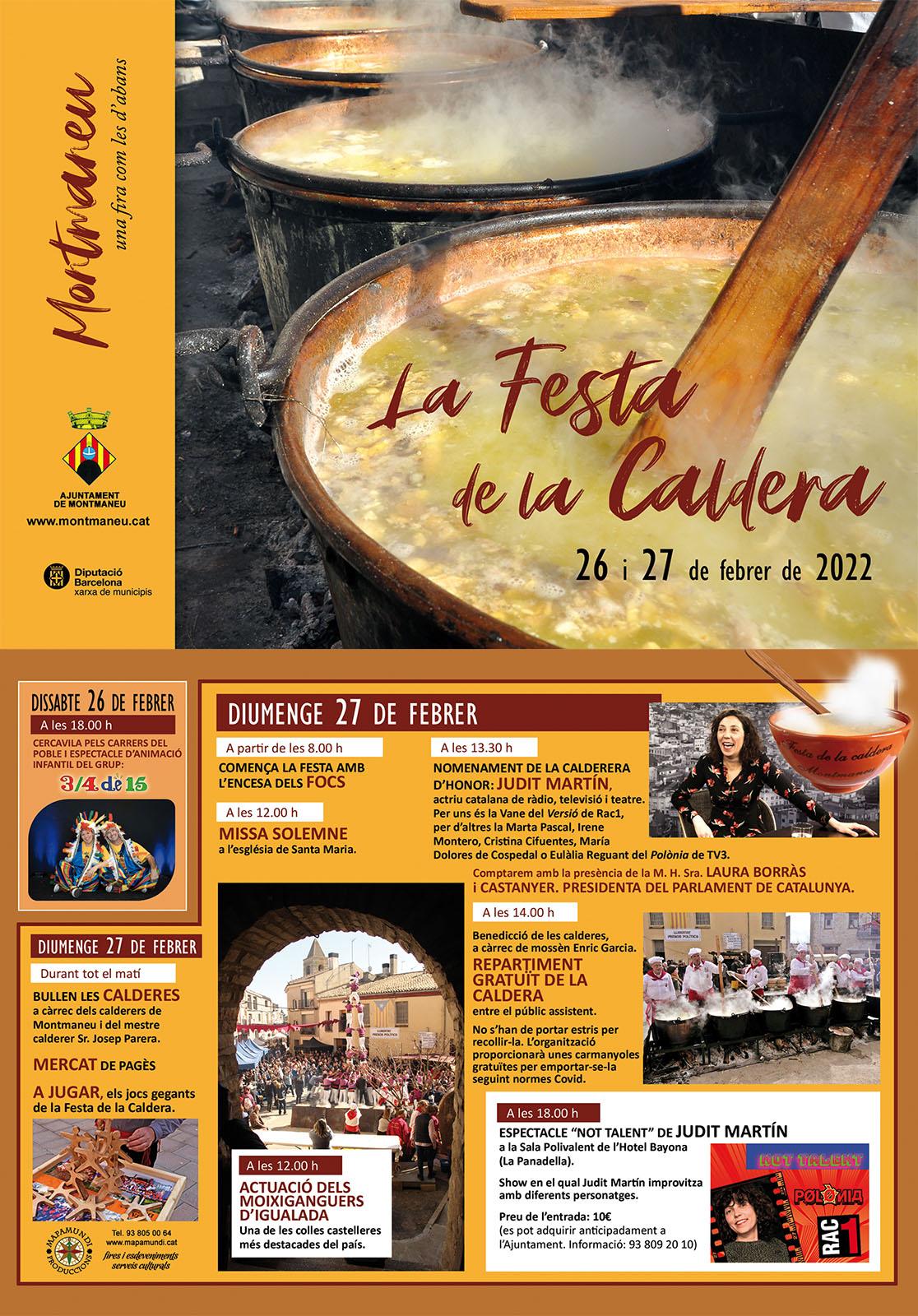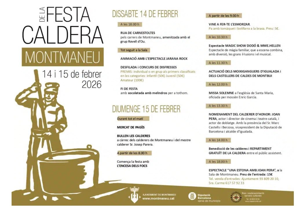 La Festa de la Caldera de Montmaneu és una de les celebracions populars d’hivern més emblemàtiques de l’Anoia. Aquesta festa tradicional catalana posa en valor la cuina popular i la convivència veïnal a través de l’elaboració d’una gran caldera col·lectiva, seguint una tradició arrelada als pobles de l’interior de Catalunya.