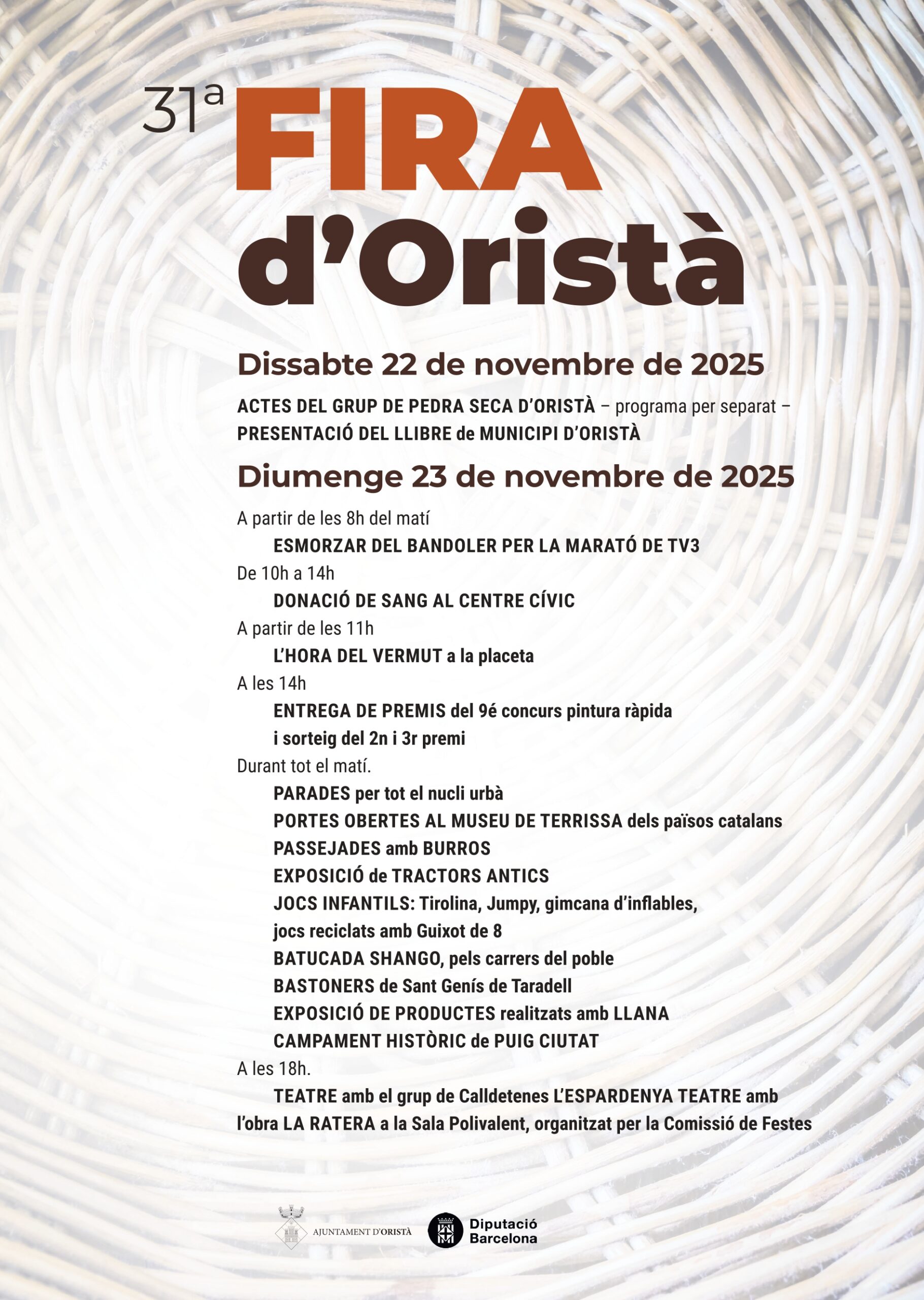 La Fira d’Artesania d’Oristà, que se celebra a la població d’Oristà, a la comarca d’Osona, és un esdeveniment dedicat a promocionar l’artesania local i tradicional. Aquesta fira té lloc a la tardor i reuneix una gran varietat d’artesans i productors que exposen i venen els seus treballs, destacant la qualitat i l’elaboració manual dels seus productes.
