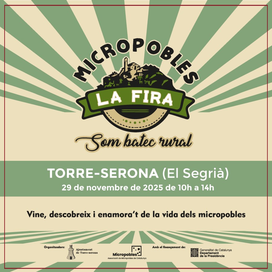 L’Associació de Micropobles de Catalunya impulsa un any més la Fira de Micropobles amb la voluntat de donar a conèixer a la ciutadania la riquesa, la diversitat i els reptes dels municipis de menys de mil habitants del país. Torre-serona, al Segrià, serà el micropoble amfitrió aquest 2025 en una edició que reunirà a més d’una vintena de poblacions de les quatre demarcacions catalanes. Cada una d’elles comptarà amb un espai propi on hi compartiran projectes, experiències, elements patrimonials turístics i culturals; així com productes propis del municipi i zona.