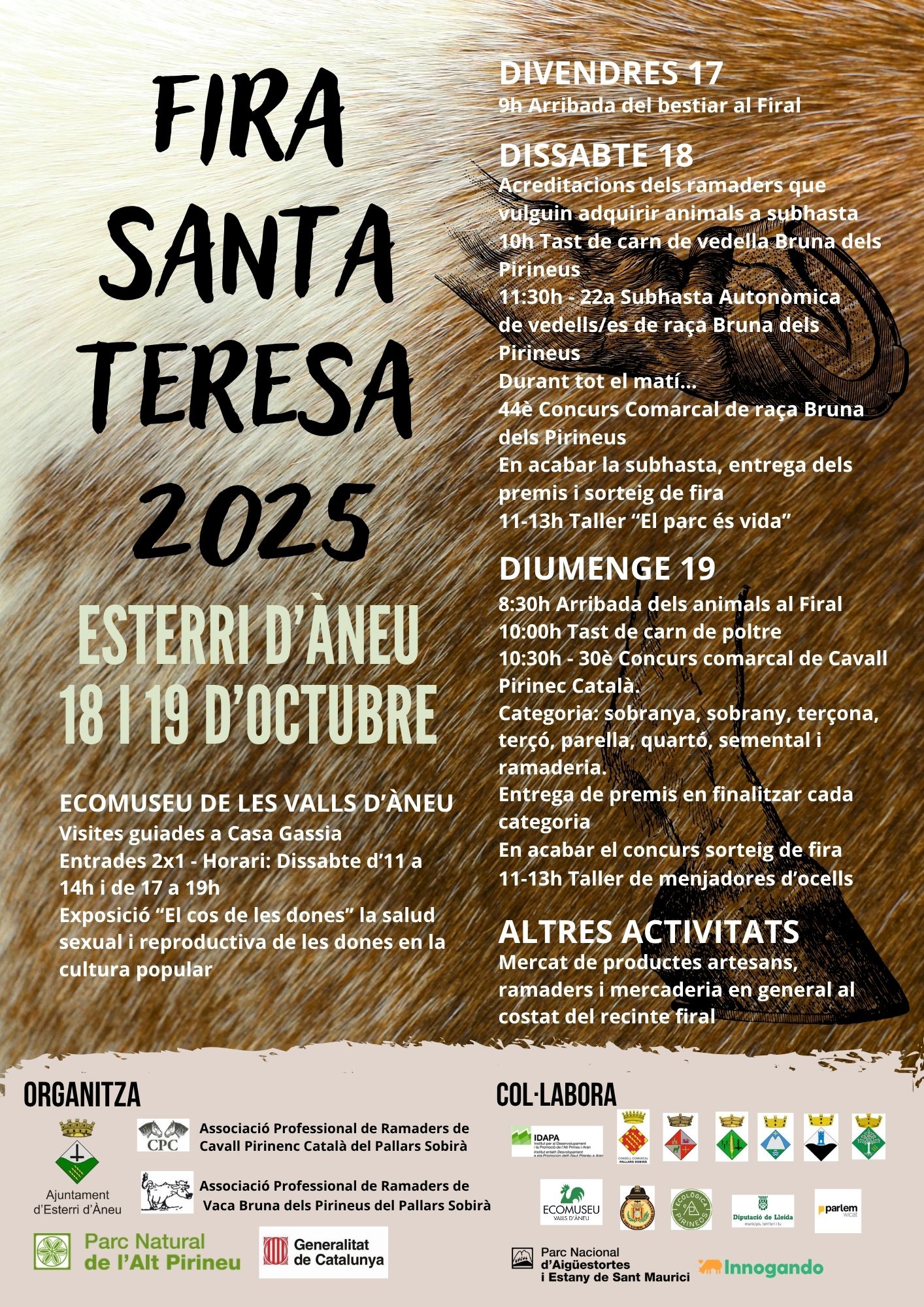 La Fira de Santa Teresa és una oportunitat per descobrir les tradicions, la cultura i la vida rural d’Esterri d’Àneu i la comarca del Pallars Sobirà, oferint un ambient acollidor i familiar. Aquesta fira combina la història i el patrimoni amb una visió moderna, tot mantenint les seves arrels i el seu caràcter de trobada entre ramaders, artesans i visitants.