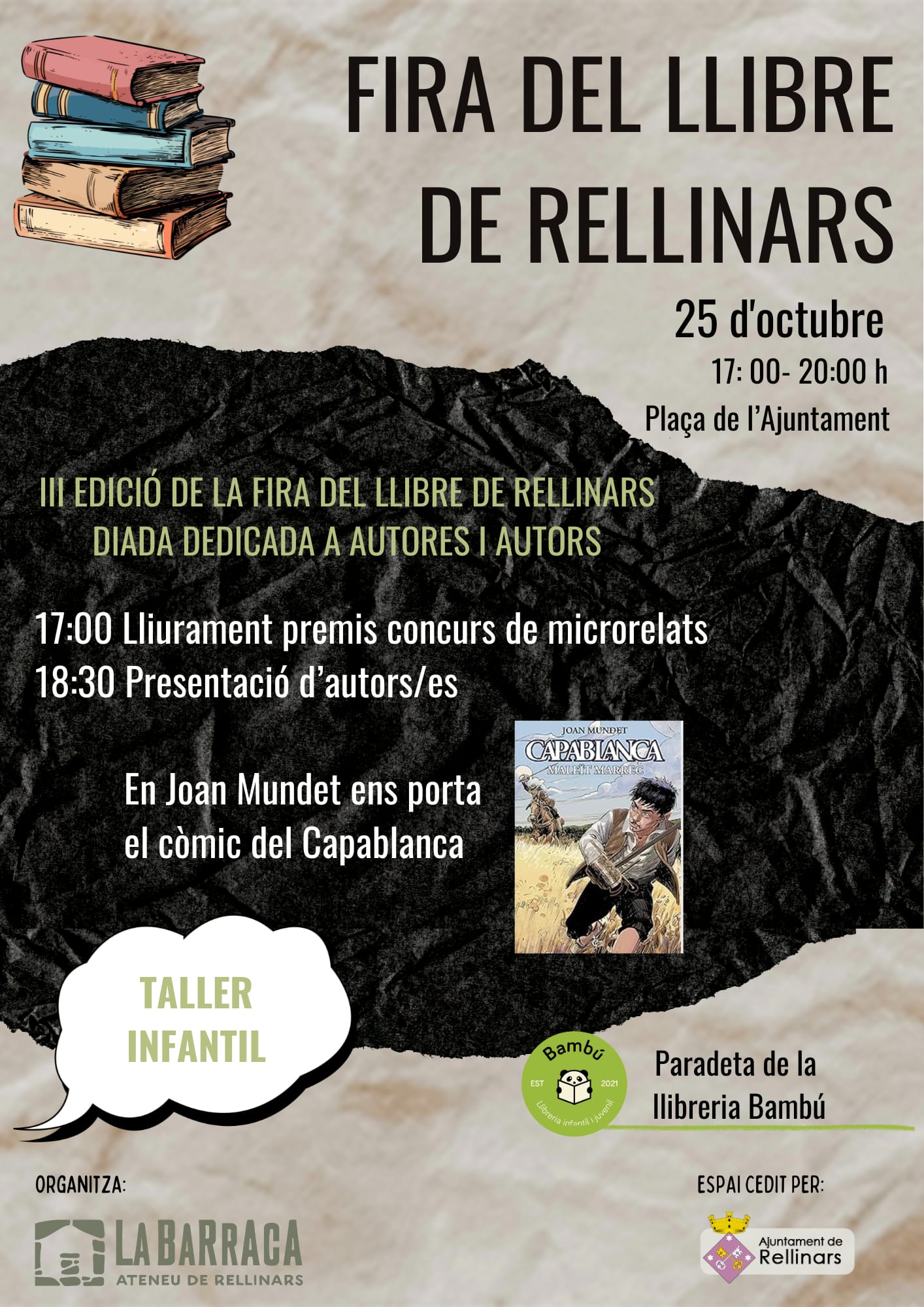 Fira del Llibre de Rellinars, organitzada per La Barraca. Amb lliurement de premis del concurs de microrelats, presentacions d’autors, taller infantil i parades amb llibres. De 17h a 20h a la Plaça de l’Ajuntament. Autors locals i un concurs de microrelats, xerrades i Club de Lectura amb la col·laboració de la Xarxa de Biblioteques de la Diputació de Barcelona i el Bibliobús La Mola.