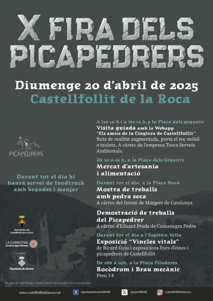 La Fira dels Picapedrers a Castellfollit és un esdeveniment únic que ret homenatge a l’ofici tradicional de la picapedreria, oferint als visitants una experiència inoblidable. A més del mercat artesanal, on es poden adquirir productes autèntics i únics, la fira compta amb exposicions que mostren la rica història i tècniques del treball en pedra. Les activitats familiars són un dels punts forts, amb tallers interactius per als més petits, actuacions en directe i una atmosfera festiva que omple els carrers del poble. La botifarrada popular és una cita ineludible per als amants de la gastronomia local, mentre que les demostracions de treballs amb pedra captiven l’atenció dels curiosos i apassionats de l’artesania. El mercat d’alimentació i artesania ofereix una gran varietat de productes, des de formatges artesanals fins a peces fetes a mà, garantint que tothom trobi alguna cosa del seu gust. Els més aventurers poden gaudir del rocòdrom i del brau mecànic, afegint un toc d’adrenalina a la jornada. A més, durant tot el dia, el servei de barra amb menjar i begudes assegura que ningú es quedi amb gana ni set. La Fira dels Picapedrers és una celebració de la tradició, la cultura i la comunitat, convertint-se en una cita imprescindible per a locals i visitants.