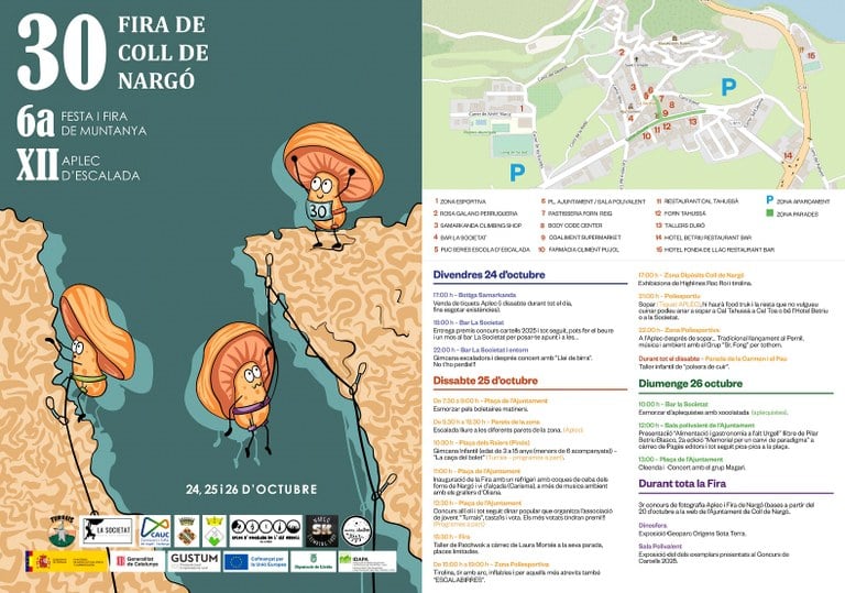 Els carrers de Coll de Nargó s’omplen de parades amb productes artesans i de proximitat, bolets, embotits, melmelades i altres delícies de tardor, mentre que els aficionats a l’escalada i a l’aventura participen en activitats, exhibicions i trobades esportives en un entorn natural privilegiat. La fira també ofereix tallers, degustacions i propostes familiars que fan gaudir petits i grans, tot reforçant el vincle del municipi amb el seu entorn muntanyenc. És una oportunitat única per descobrir l’esperit actiu i autèntic de l’Alt Urgell, passejar pels seus paratges i viure un cap de setmana ple de natura, tradició i bon ambient al cor dels Pirineus.