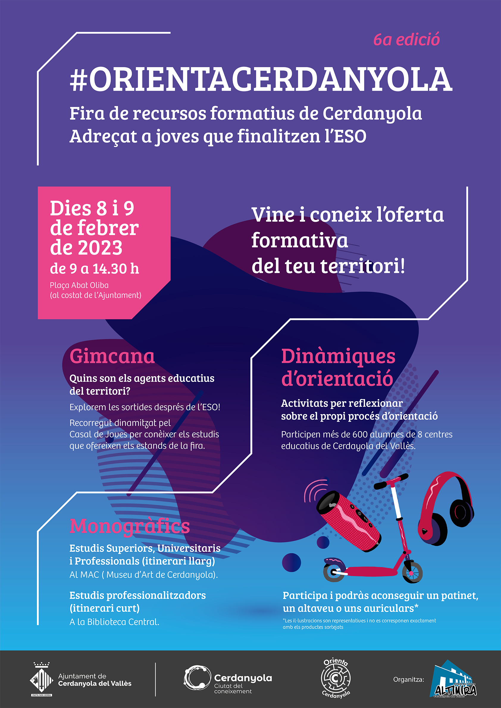 Els joves de Cerdanyola que estan cursant 4t d’ESO visitaran la Fira Orienta Cerdanyola. La Fira forma part del programa Orienta adreçat als joves que estan acabant els estudis obligatoris i es duu a terme durant tot el curs.
