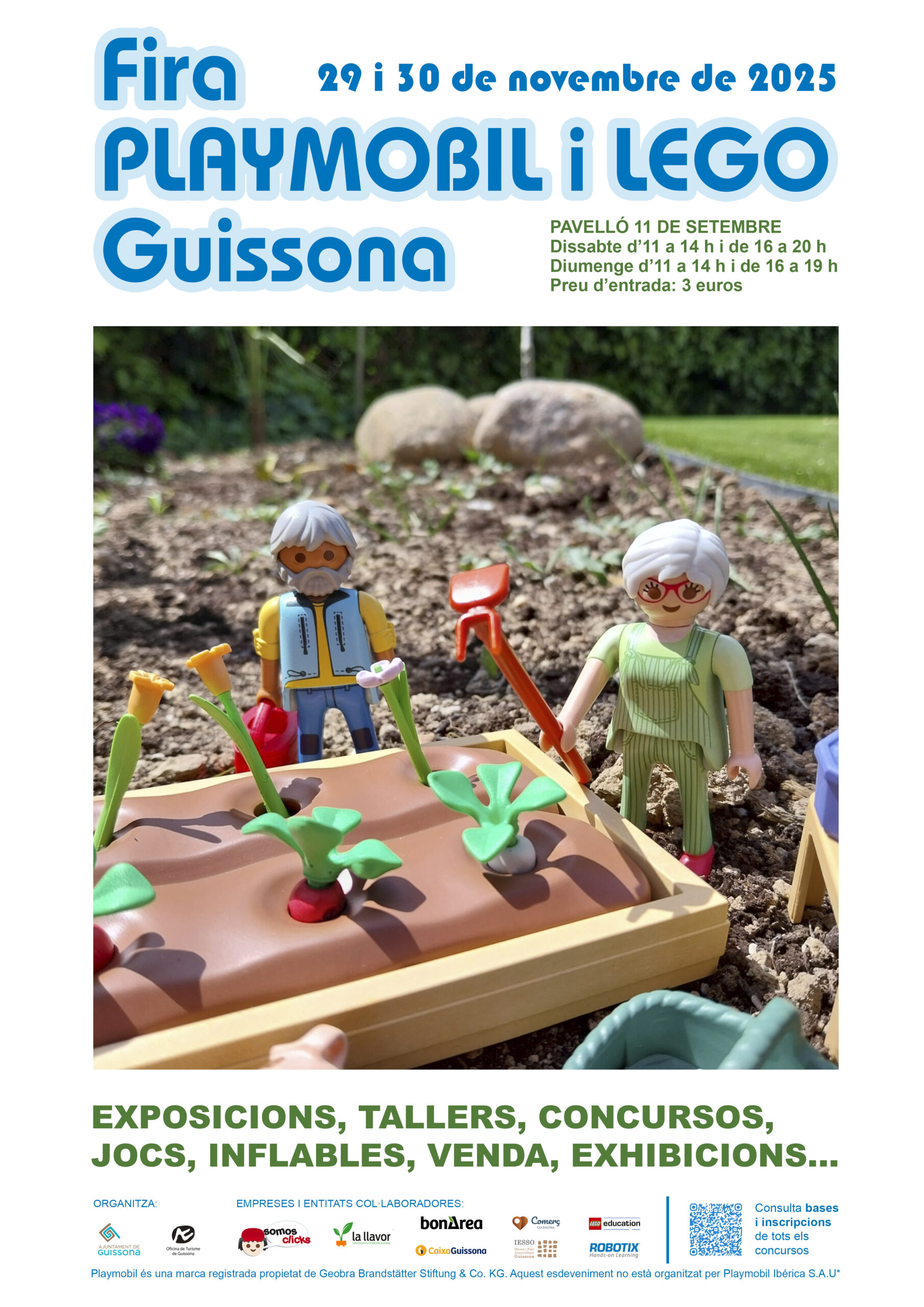 La Fira Playmobil i Lego de Guissona, celebrada a la vila de Guissona, al cor de la Segarra, és un esdeveniment lúdic i familiar que reuneix petits i grans amants dels jocs de construcció i de les icòniques figures de Playmobil. Una cita imprescindible per a famílies i col·leccionistes que volen gaudir d’una jornada plena de creativitat, imaginació i diversió.