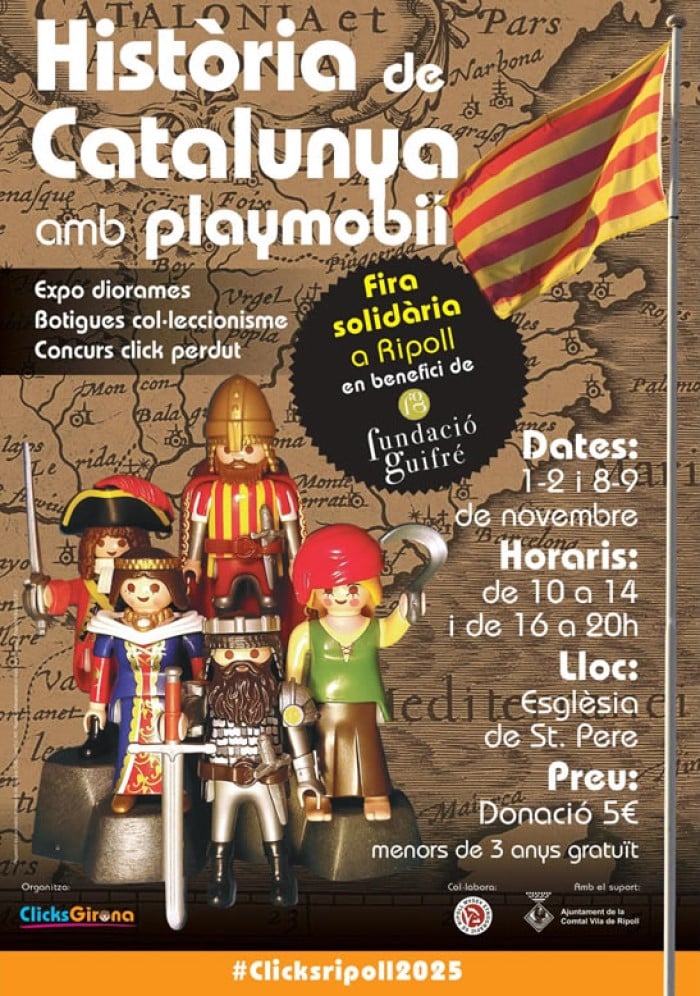 Ripoll es converteix en el paradís dels amants dels clicks amb la Fira Playmobil, una cita imprescindible per a petits i grans col·leccionistes. L’esdeveniment tindrà lloc a l’emblemàtica Església de Sant Pere (Pl. Abat Oliba) i obrirà portes en horari de 10 a 14 h i de 16 a 20 h. Per només 5 € (entrada gratuïta per a menors de 3 anys), podràs gaudir d’exposicions espectaculars, escenes temàtiques, paradetes de compra i venda i moltes sorpreses més.