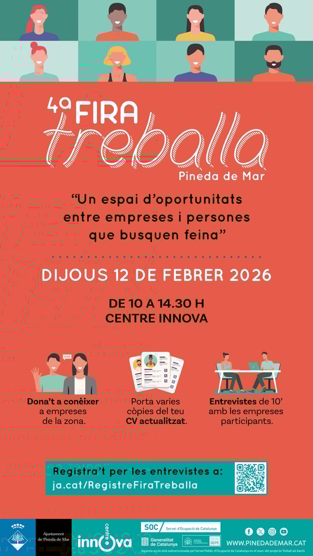 Si ets una empresa i busques personal, o si estàs buscant feina i vols una oportunitat, ja pots apuntar-te a Fira Treballa. Es tracta d’un espai d’oportunitats per connectar persones que busquen feina amb empreses del territori. Serà dijous,12 de febrer, al matí, al Centre Innova de l’Ajuntament de Pineda.