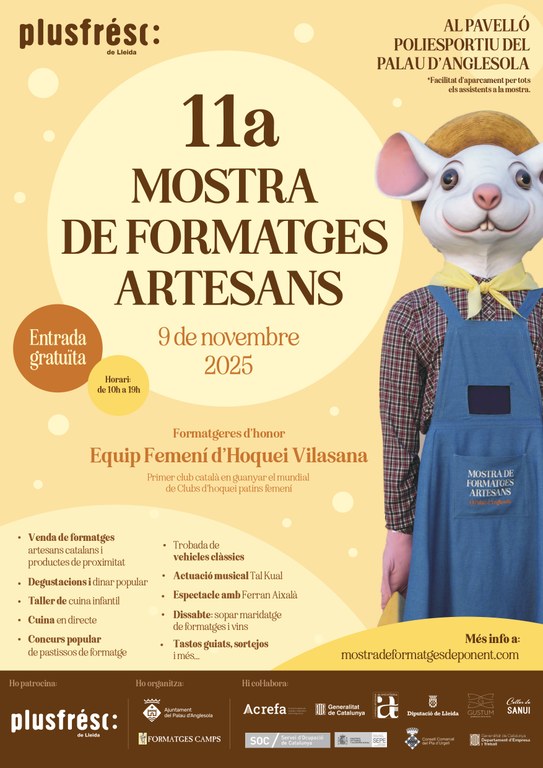 Tindrà lloc el proper diumenge 9 de novembre de les 10 fins a les 19 del vespre al pavelló poliesportiu del Palau d’Anglesola, amb facilitat d’aparcament per tots els assistents a la mostra. Degustacions de formatgers artesans, concurs de pastissos de formatge, exposicions d’art temàtic, maridatges, sortejos i sobretot… MOLT FORMATGE!